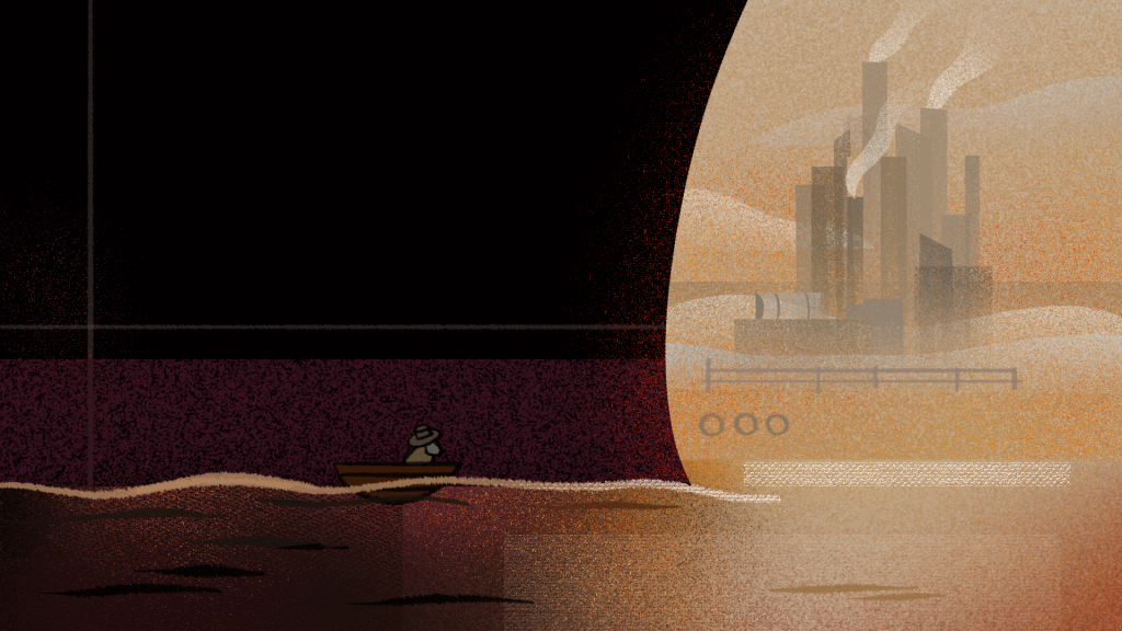 In the idyllic ocean, sea creatures live by the corals that provide them with food and shelter. Lives were normal for the little fish and its family, until one day, the corals bleach. Like many other fellow sea creatures, no longer able to survive, the little fish family begins to migrate to other part of the ocean. Along the way, they pass by increasing amount of foreign objects in place of corals. Eventually, the family encounters a desperately hungry shark that chases them down for food. The parents sacrifice themselves to let the little one get away. Then, attracted by the lights, the little fish finds itself among huge underwater machinery and that very same shark once again. This time, the chase ends with the shark getting caught in an industrial accident that falls upon him. Finally safe, the little fish manages to find food, only to be brought out of the ocean by the world above that exploits and ruins everything below.